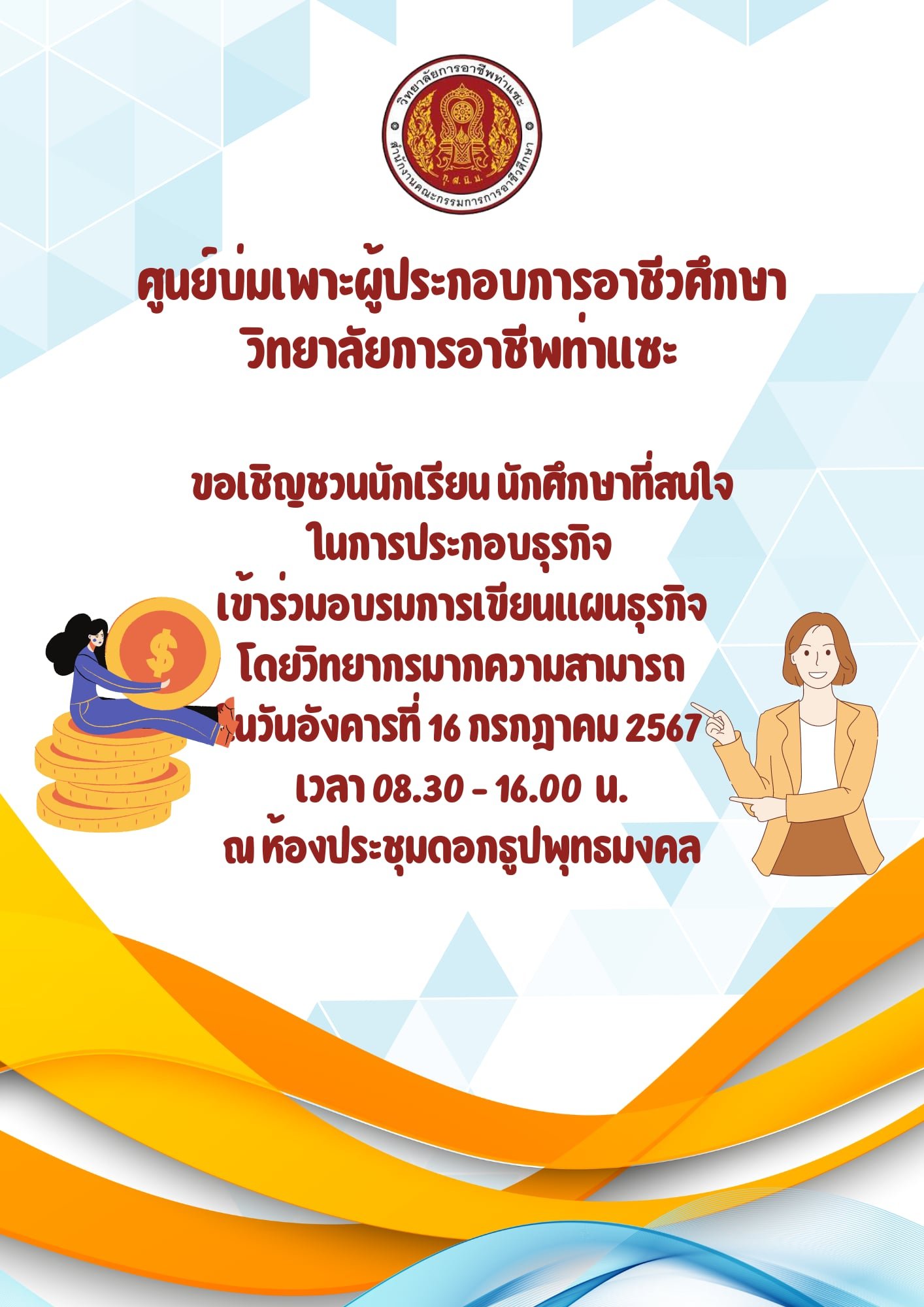 ศูนย์บ่มเพาะผู้ประกอบการอาชีวศึกษา ขอเชิญชวนนักเรียน นักศึกษา เข้าร่วมโครงการอบรมเชิงปฏิบัติการบ่มเพาะผู้ประกอบการอาชีวศึกษา โดยเป็นการเข้าร่วมเขียนแผนธุรกิจ ในวันอังคารที่ 16 กรกฎาคม 2567 ณ ห้องประชุมดอกธูปพุทธมงคล :: วิทยาลัยการอาชีพท่าแซะ