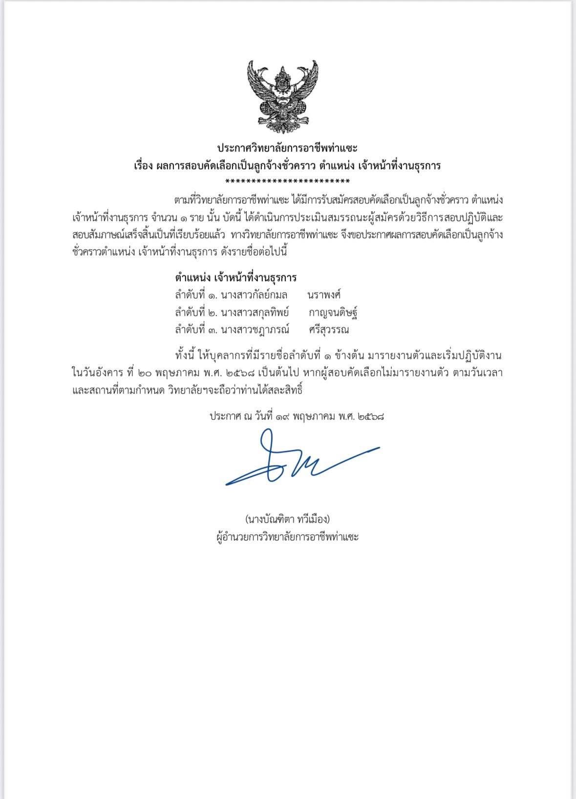 ประกาศวิทยาลัยการอาชีพท่าแซะ — ผลการสอบคัดเลือกเป็นลูกจ้าง ตำแหน่ง เจ้าหน้าที่งานธุรการ —-