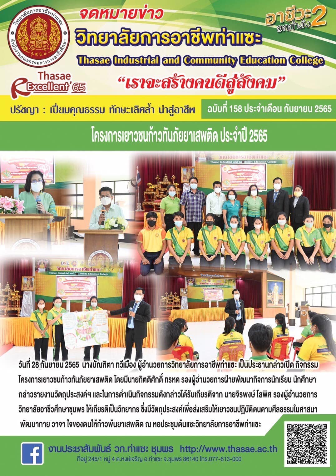 วันที่ 28 กันยายน 2565 นางบัณฑิตา ทวีเมือง ผู้อำนวยการวิทยาลัยการอาชีพท่าแซะ เป็นประธานกล่าวเปิด กิจกรรมโครงการเยาวชนก้าวทันภัยยาเสพติด โดยมีนายกิตติศักดิ์ ทรหด รองผู้อำนวยการฝ่ายพัฒนากิจการนักเรียน นักศึกษา กล่าวรายงานวัตถุประสงค์ฯ และในการดำเนินกิจกรรม :: วิทยาลัยการอาชีพท่าแซะ