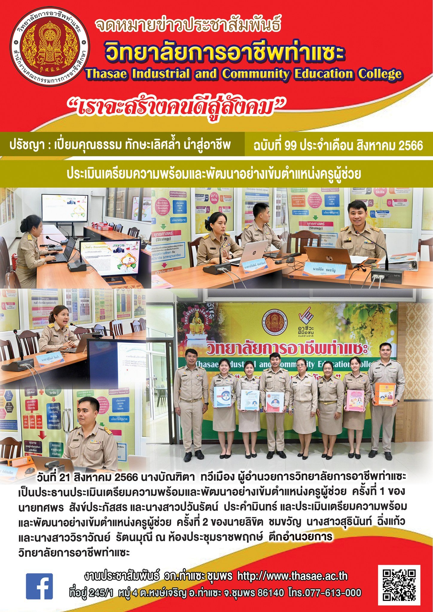 วันที่ 21 สิงหาคม 2566 นางบัณฑิตา ทวีเมือง ผู้อำนวยการวิทยาลัยการอาชีพท่าแซะ เป็นประธานประเมินเตรียมความพร้อมและพัฒนาอย่างเข้มตำแหน่งครูผู้ช่วย ครั้งที่ 1 :: วิทยาลัยการอาชีพท่าแซะ