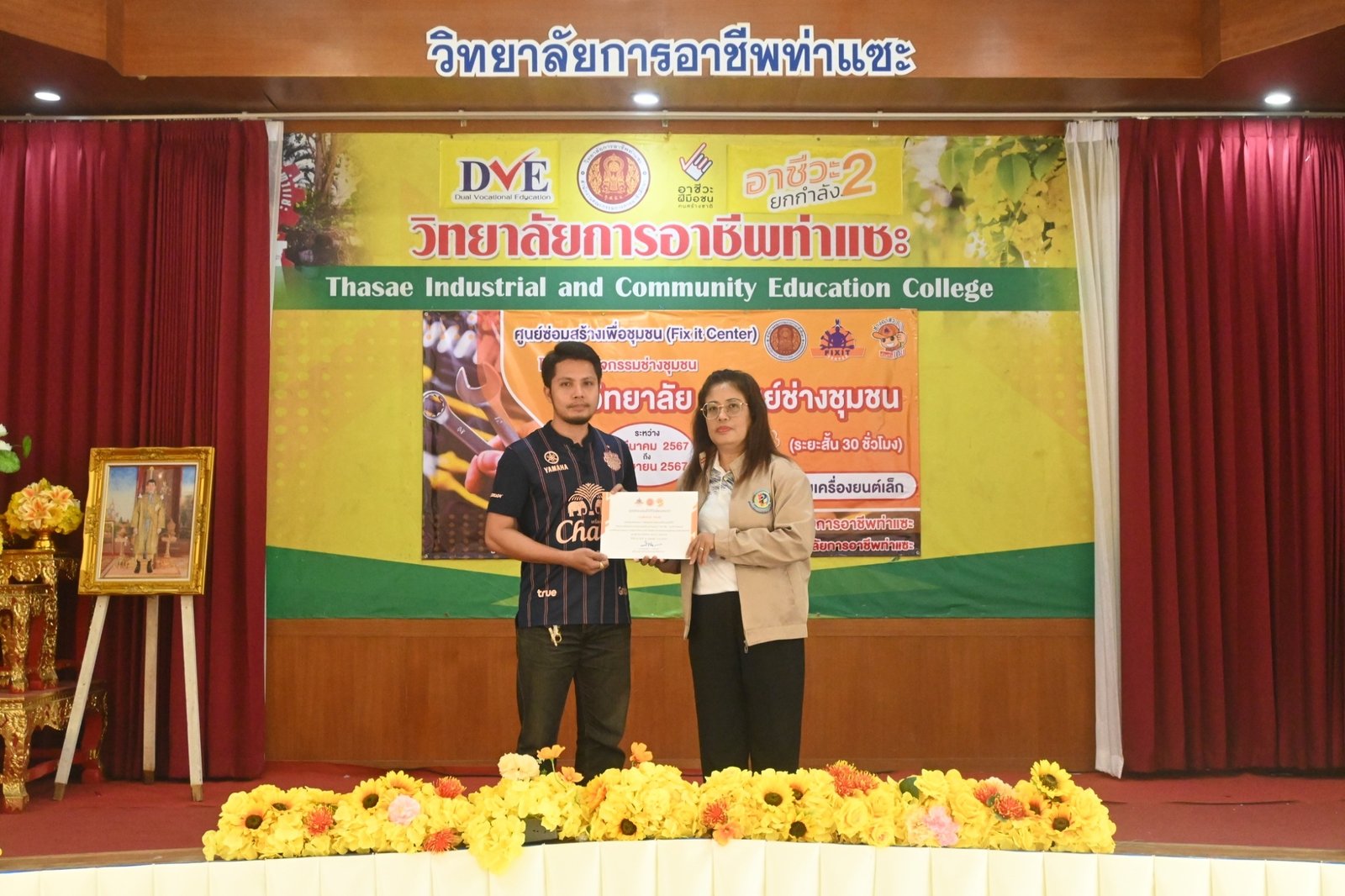 วันที่ 6 เมษายน 2567 นางบัณฑิตา ทวีเมือง ผู้อำนวยการวิทยาลัยการอาชีพท่าแซะ เป็นประธานมอบเกียรติบัตรให้แก่วิทยากร และผู้ผ่านการอบรมในหลักสูตรช่างซ่อมเครื่องยนต์เล็ก ภายใต้โครงการกิจกรรมช่างชุมชน 1 วิทยาลัย 1 ศูนย์ช่างชุมชน ระหว่างวันที่ 23 มีนาคม 2567 ถึง :: วิทยาลัยการอาชีพท่าแซะ