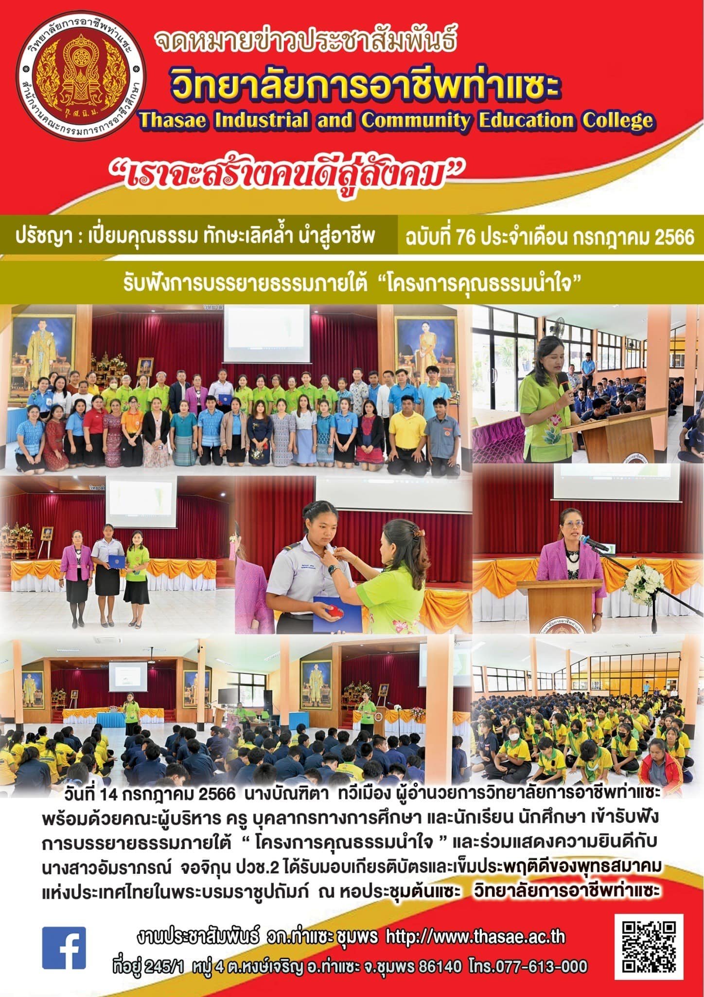 รายงานข่าวจากงานประชาสัมพันธ์ : วันที่ 14 กรกฎาคม 2566 นางบัณฑิตา ทวีเมือง ผู้อำนวยการวิทยาลัยการอาชีพท่าแซะ พร้อมด้วยคณะผู้บริหาร ครู บุคลากรทางการศึกษา และนักเรียน นักศึกษา เข้ารับฟังการบรรยายธรรมภายใต้ โครงการคุณธรรมนำใจ :: วิทยาลัยการอาชีพท่าแซะ