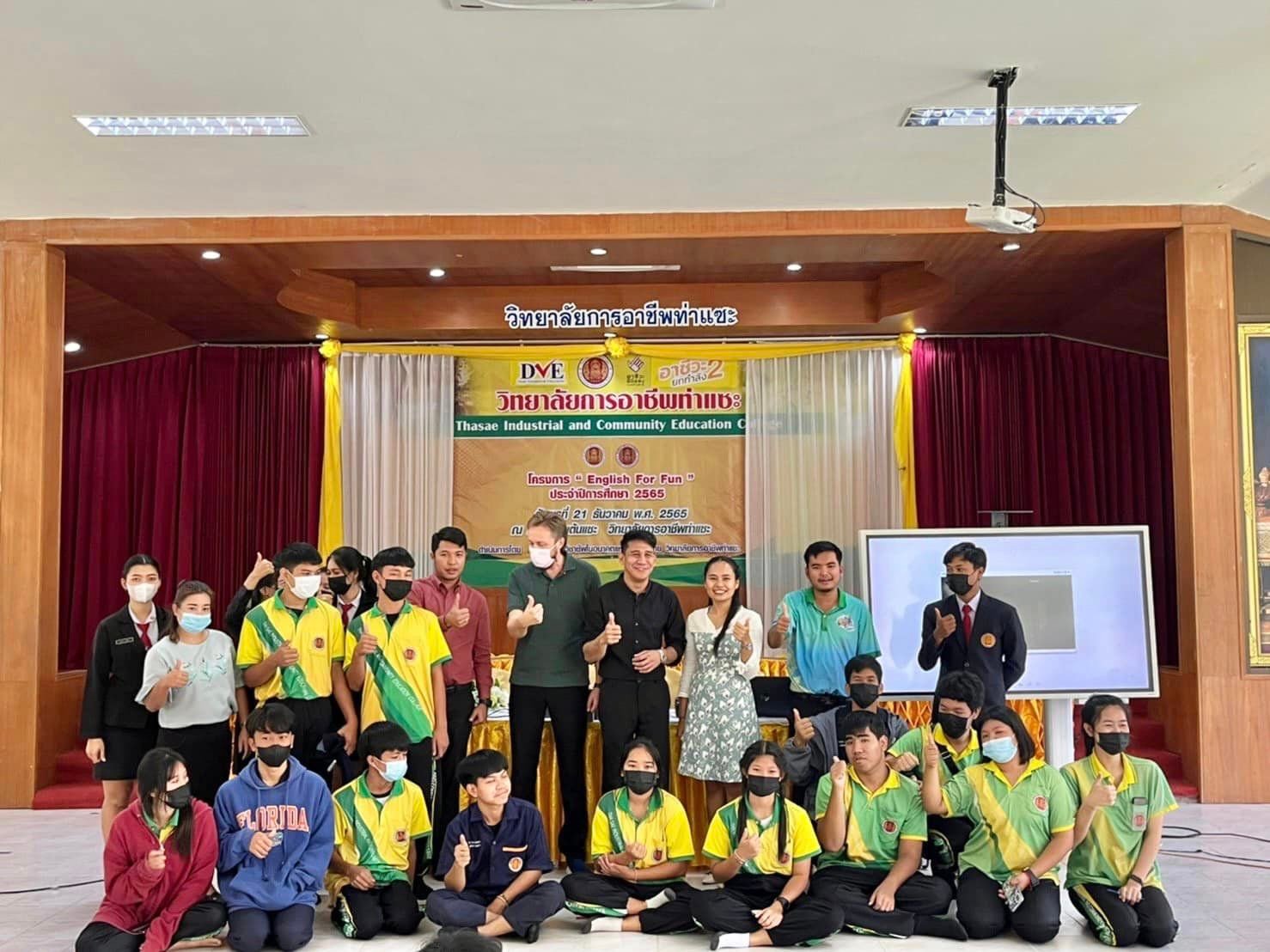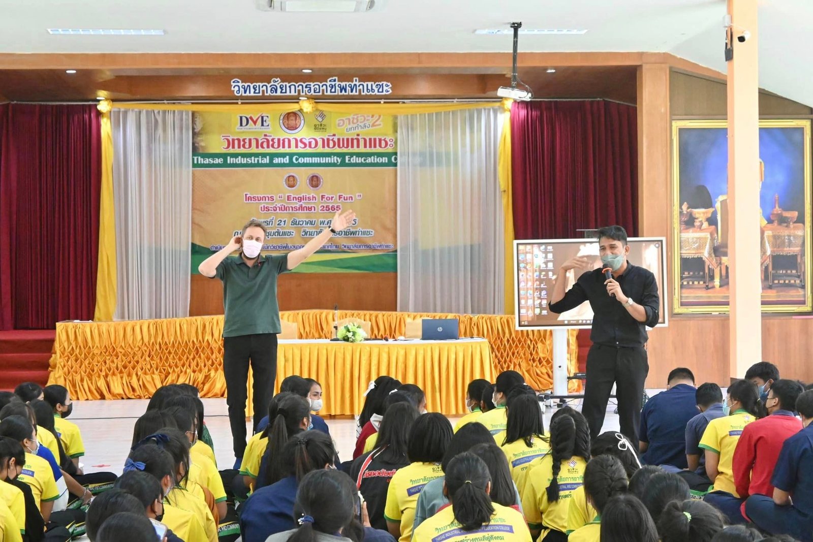 วันที่ 21 ธันวาคม 2565 นางบัณฑิตา ทวีเมือง ผู้อำนวยการวิทยาลัยการอาชีพท่าแซะ พร้อมด้วยคณะครู บุคลากรทางการศึกษา และนักเรียน นักศึกษา เข้าร่วมโครงการ “English For Fun” ประจำปีการศึกษา 2565 เพื่อสร้างโอสการทางการเรียนรู้ด้านภาษาอังกฤษให้กับนักเรียน นักศึก :: วิทยาลัยการอาชีพท่าแซะ
