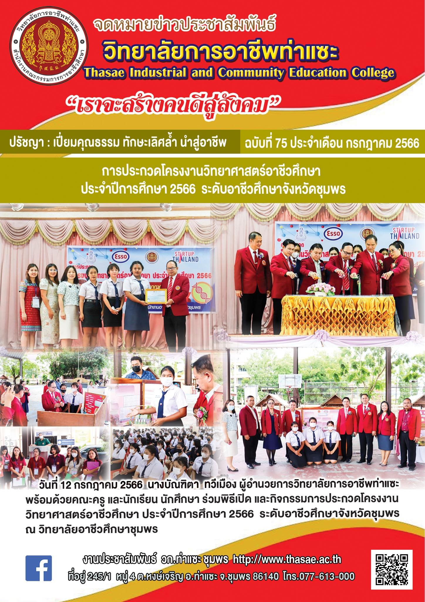 รายงานข่าวจากงานประชาสัมพันธ์ : วันที่ 12 กรกฎาคม 2566 นางบัณฑิตา ทวีเมือง ผู้อำนวยการวิทยาลัยการอาชีพท่าแซะ พร้อมด้วยคณะครู และนักเรียน นักศึกษา ร่วมพิธีเปิด และกิจกรรมการประกวดโครงงานวิทยาศาสตร์อาชีวศึกษา ประจำปีการศึกษา 2566 :: วิทยาลัยการอาชีพท่าแซะ