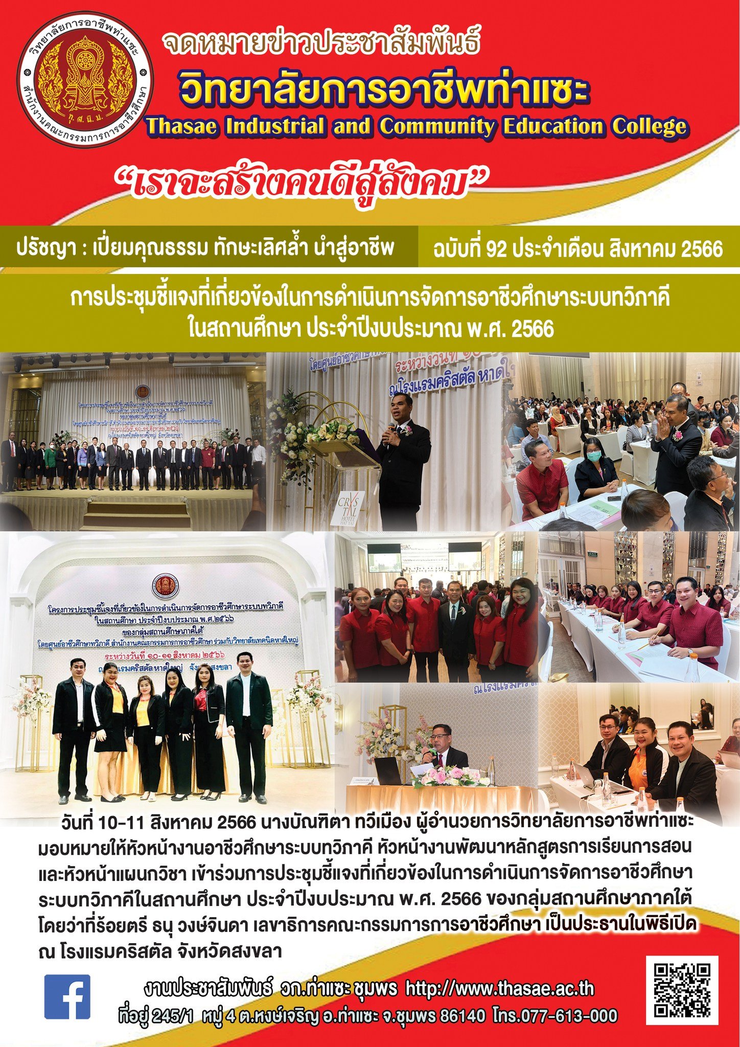 วันที่ 10-11 สิงหาคม 2566 นางบัณฑิตา ทวีเมือง ผู้อำนวยการวิทยาลัยการอาชีพท่าแซะ มอบหมายให้หัวหน้างานอาชีวศึกษาระบบทวิภาคี หัวหน้างานพัฒนาหลักสูตรการเรียนการสอน และหัวหน้าแผนกวิชา เข้าร่วมการประชุมชี้แจงที่เกี่ยวข้องในการดำเนินการจัดการอาชีวศึกษาระบบทวิภาค :: วิทยาลัยการอาชีพท่าแซะ