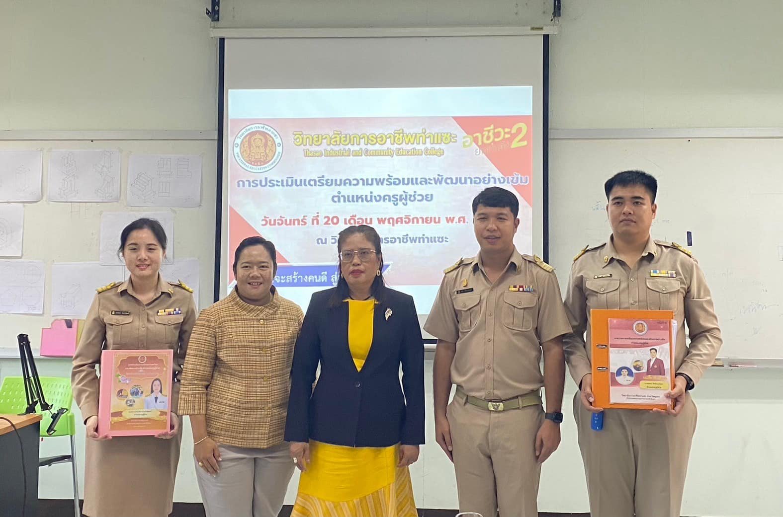 วันที่ 20 พฤศจิกายน 2566 นางบัณฑิตา ทวีเมือง ผู้อำนวยการวิทยาลัยการอาชีพท่าแซะ เป็นประธานประเมินเตรียมความพร้อมและพัฒนาอย่างเข้มตำแหน่งครูผู้ช่วย ครั้งที่ 2 ของนายทศพร สังข์ประภัสสร ครูประจำแผนกวิชาช่างไฟฟ้ากำลัง และนางสาวปวันรัตน์ ประคำมินทร์ ครูประจำ :: วิทยาลัยการอาชีพท่าแซะ