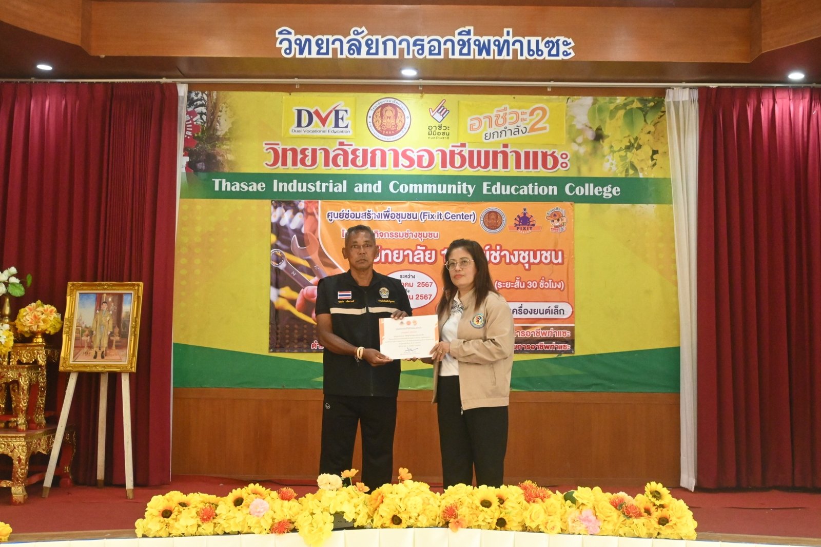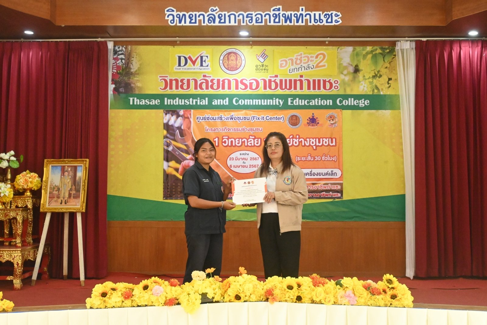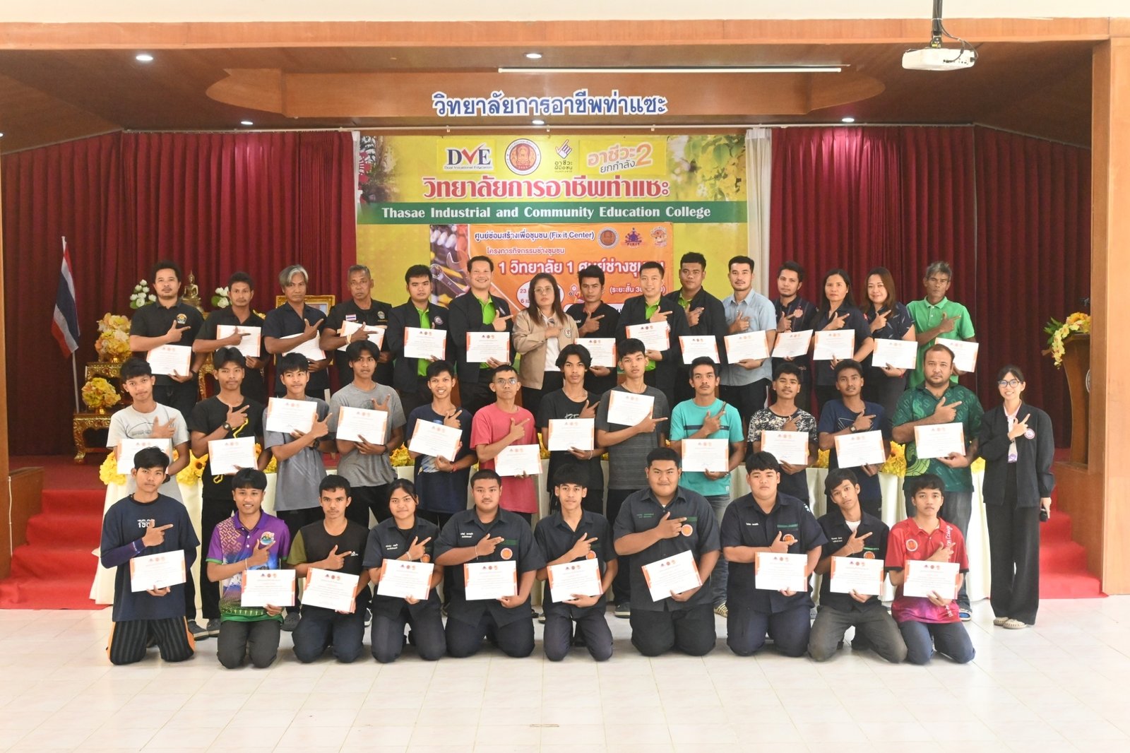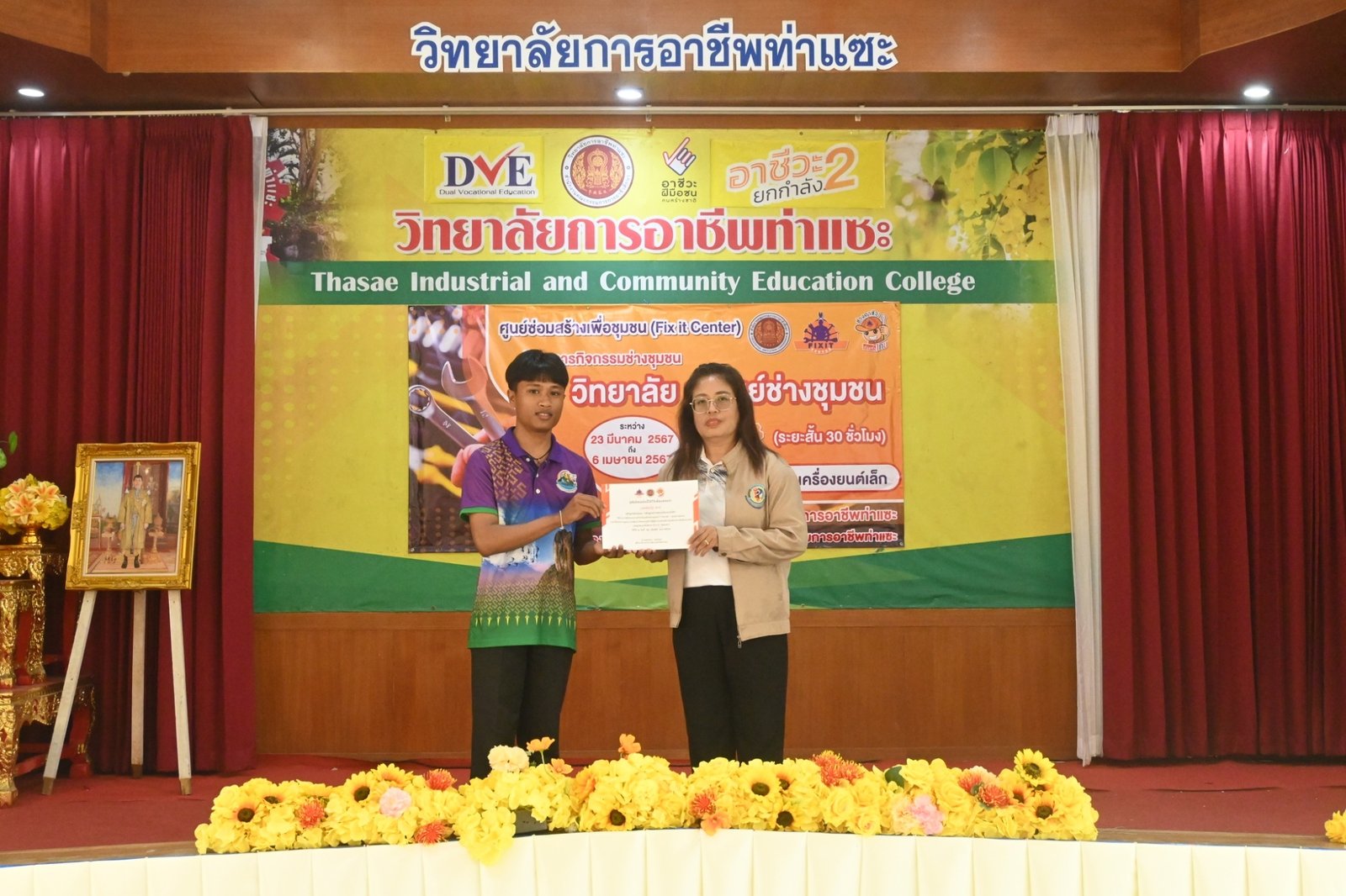 วันที่ 6 เมษายน 2567 นางบัณฑิตา ทวีเมือง ผู้อำนวยการวิทยาลัยการอาชีพท่าแซะ เป็นประธานมอบเกียรติบัตรให้แก่วิทยากร และผู้ผ่านการอบรมในหลักสูตรช่างซ่อมเครื่องยนต์เล็ก ภายใต้โครงการกิจกรรมช่างชุมชน 1 วิทยาลัย 1 ศูนย์ช่างชุมชน ระหว่างวันที่ 23 มีนาคม 2567 ถึง :: วิทยาลัยการอาชีพท่าแซะ