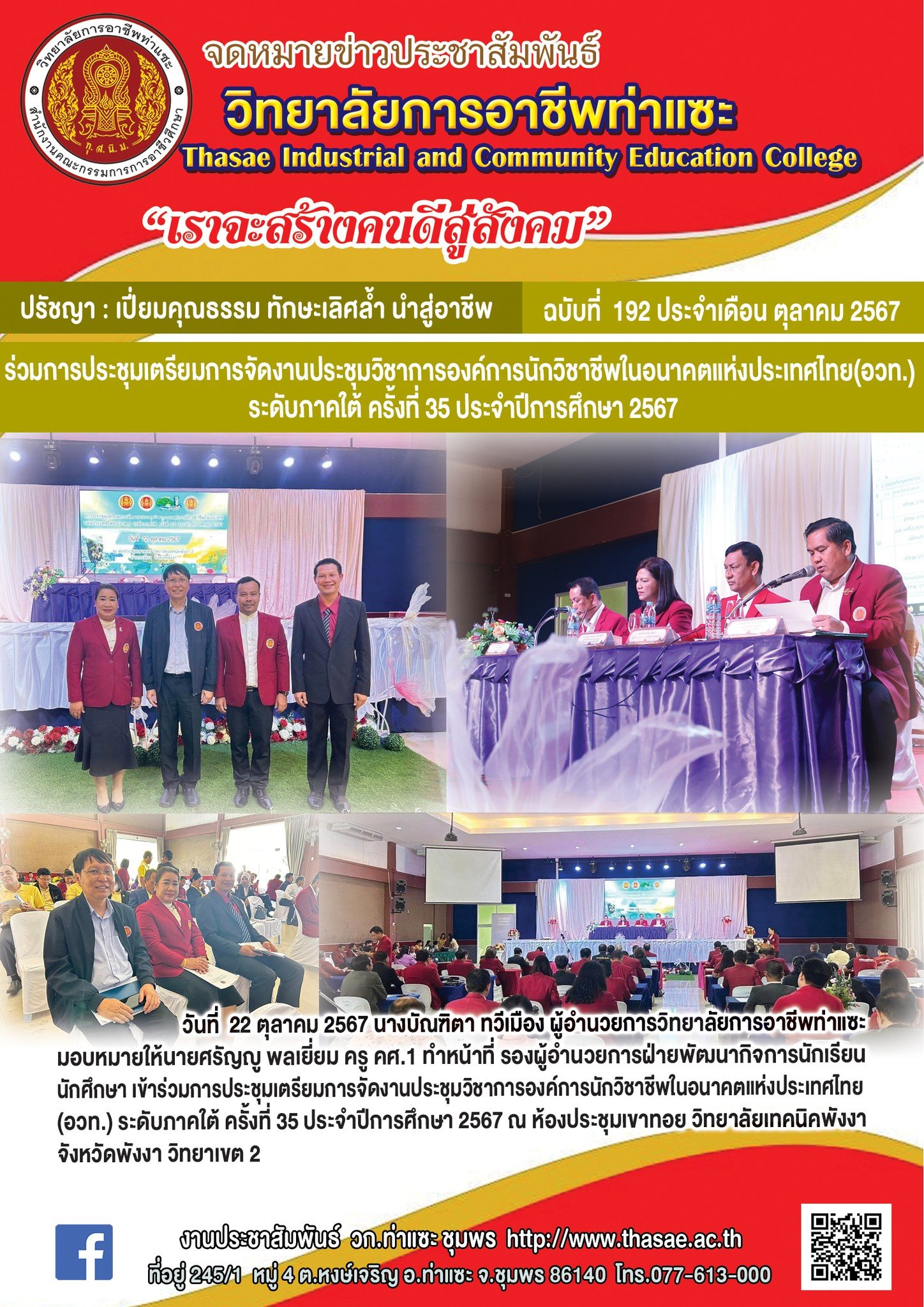 วันที่ 5 พฤศจิกายน 2568 นายชนาธิวัฒน์ ซารัมย์ รองผู้อำนวยการฯ รักษาการในตำแหน่ง ผู้อำนวยการวิทยาลัยการอาชีพท่าแซะ พร้อมด้วยคณะผู้บริหาร ครู บุคลากรทางการศึกษา และนัก..