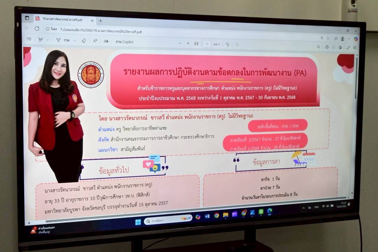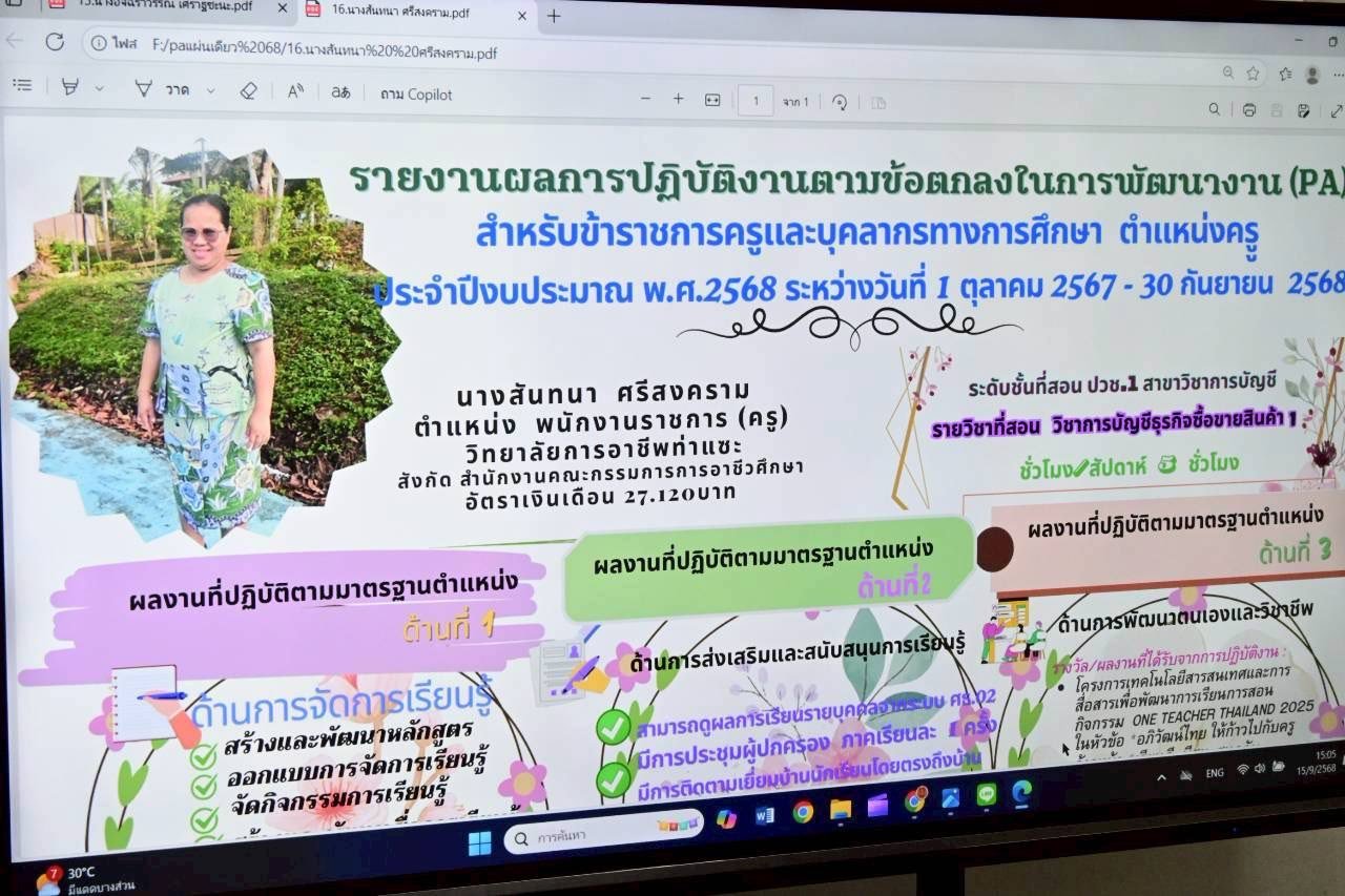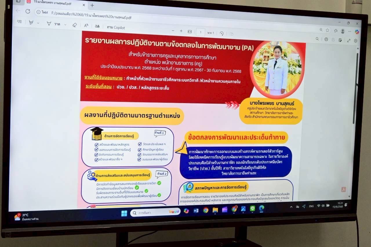 วันที่ 15 กันยายน 2568 คณะครูวิทยาลัยการอาชีพท่าแซะเข้ารับการประเมินผลการปฏิบัติงานตามข้อตกลง PA (Performance Agreement) สำหรับข้าราชการครูและบุคลากรทางการศึกษาปีงบประมาณ 2568 (รอบการประเมิน 1 ตุลาคม 2567- 30 กันยายน 2568) โดยได้รับความอนุเคราะห์จากคณะกร :: วิทยาลัยการอาชีพท่าแซะ