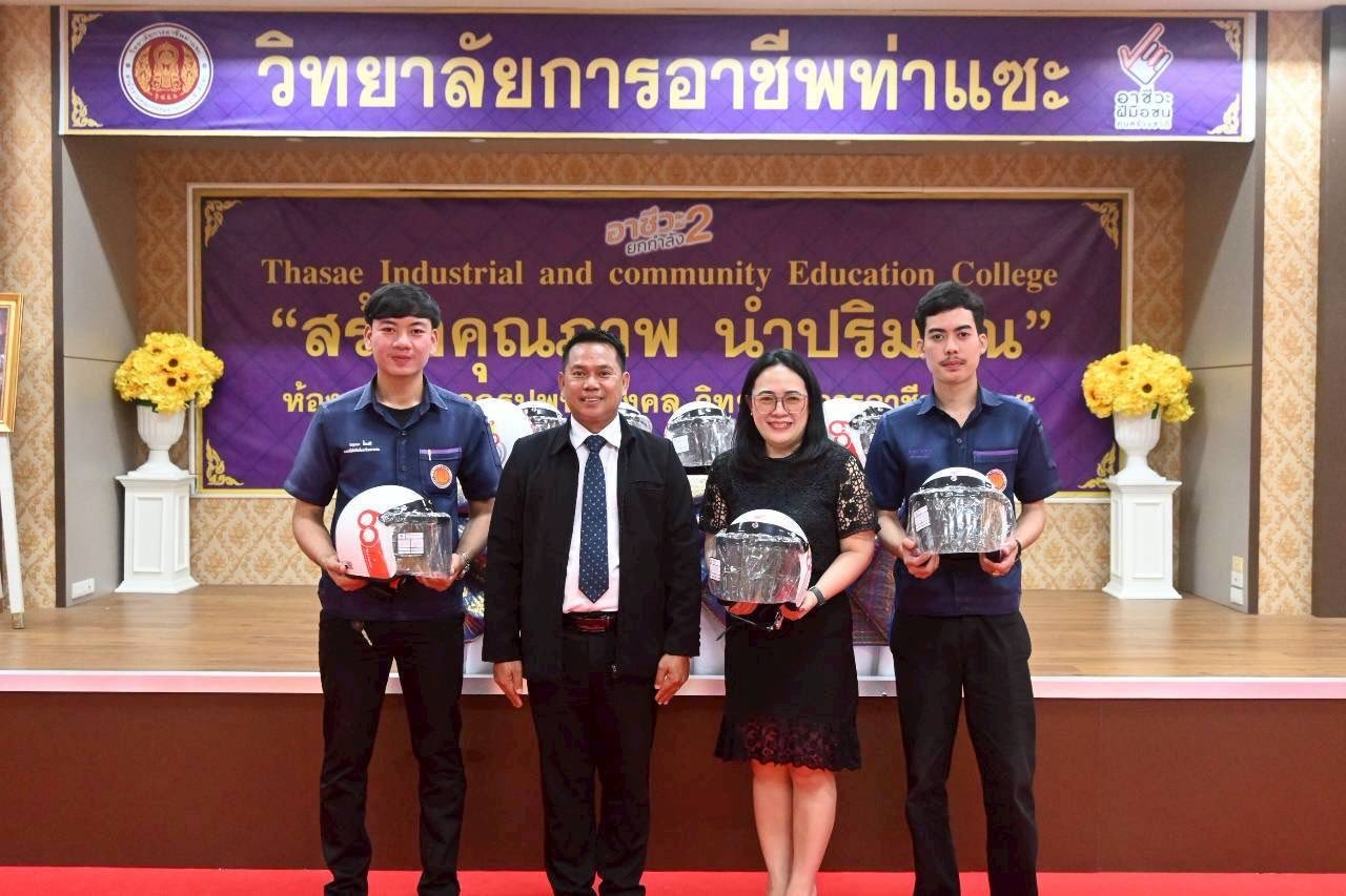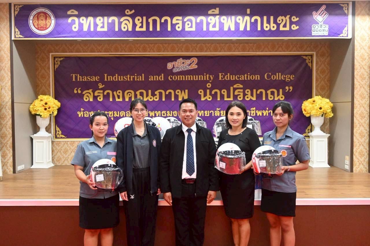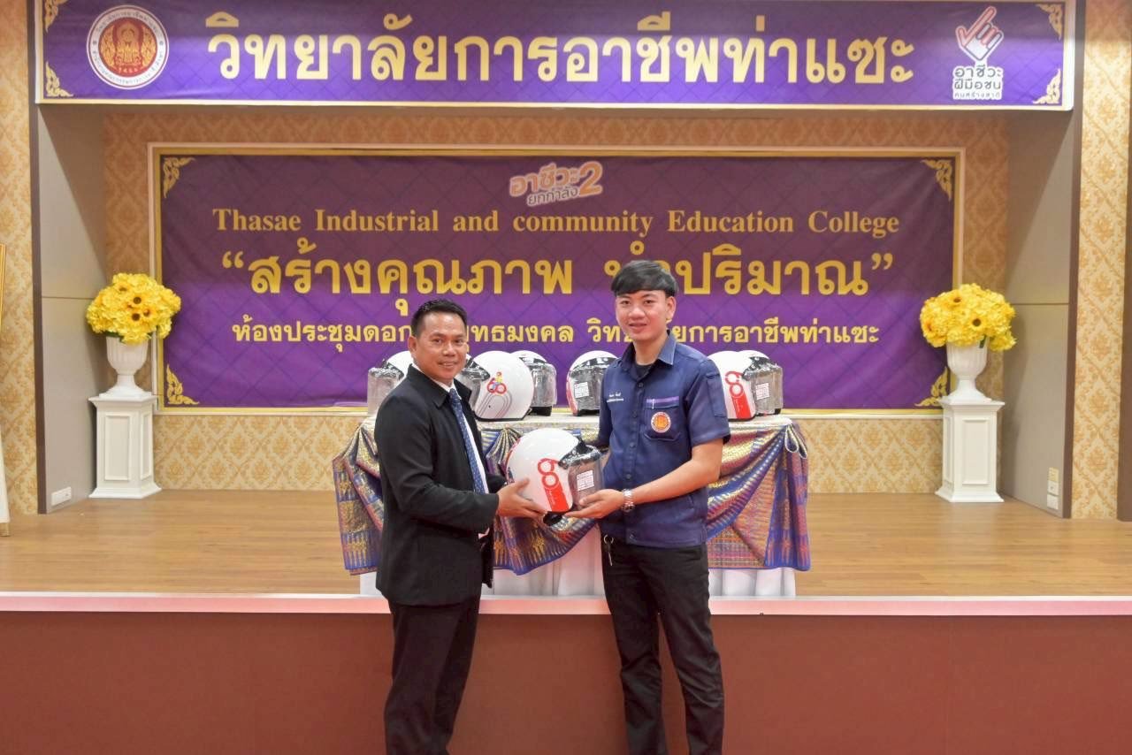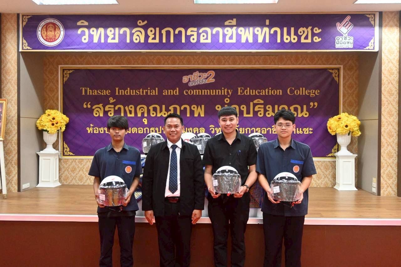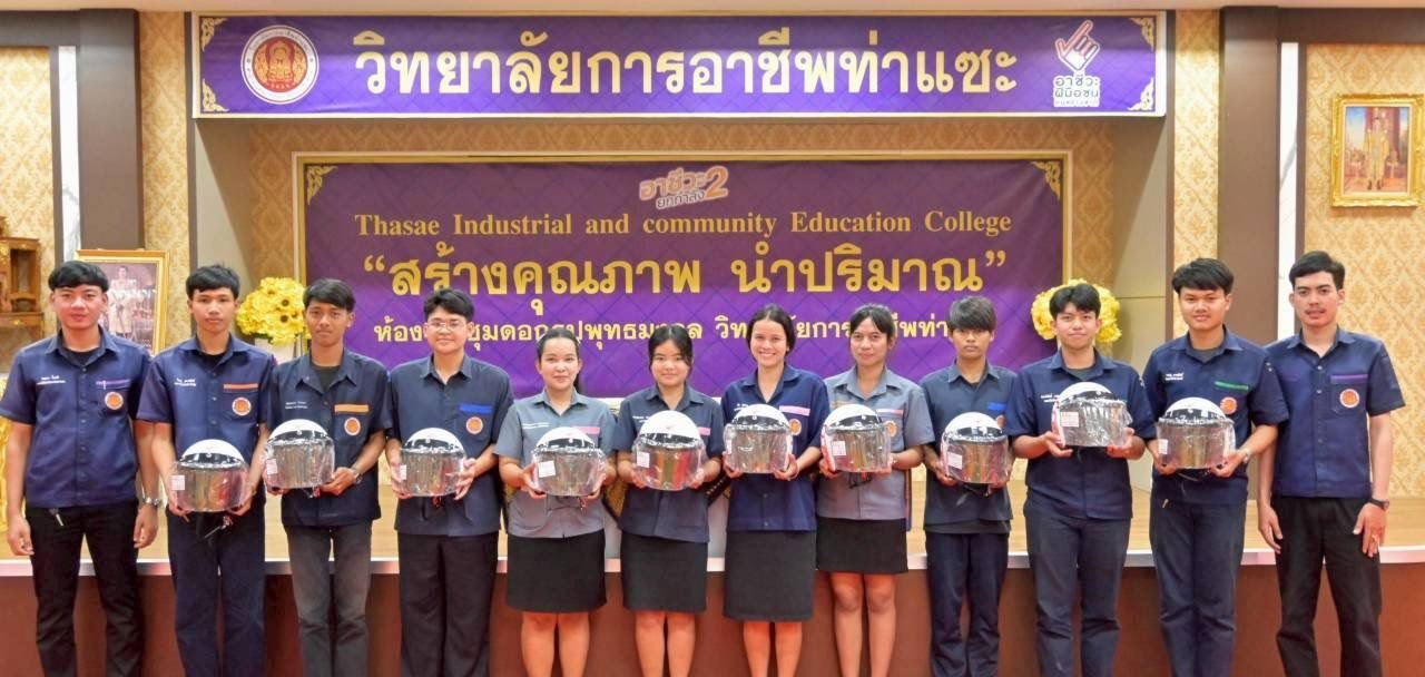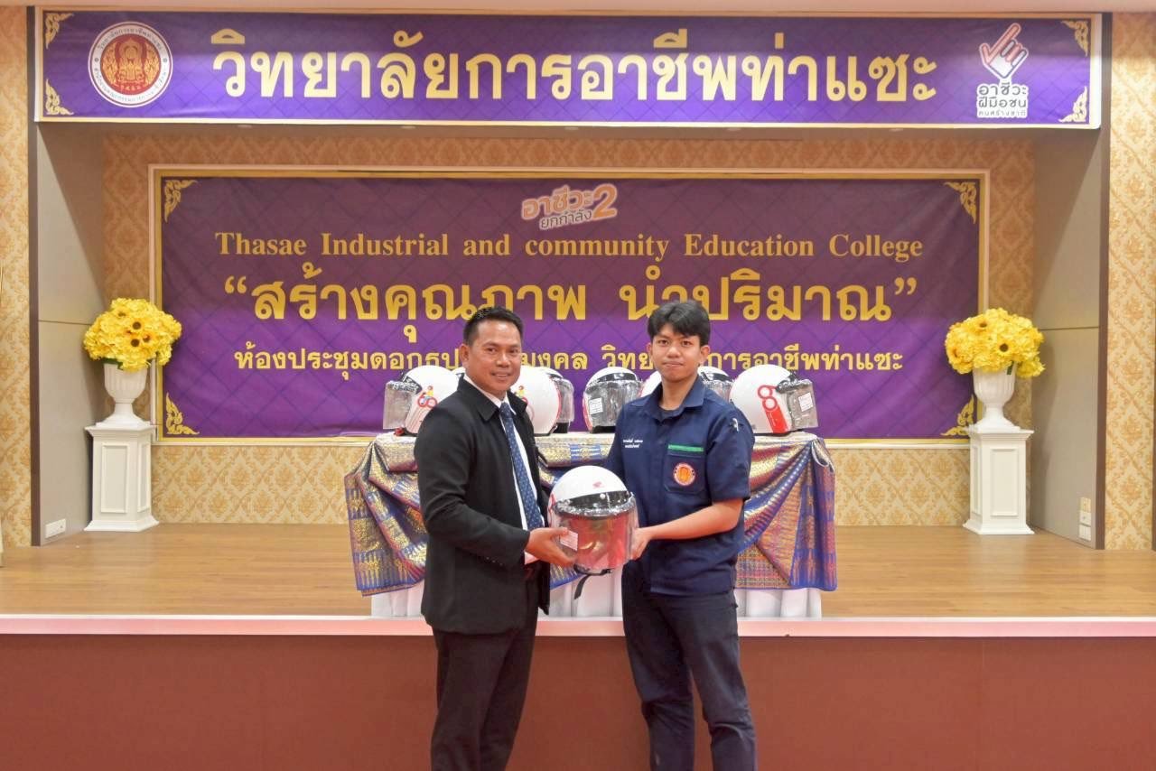 วันที่ 11 ธันวาคม 2568 นายชนาธิวัฒน์ ซารัมย์ รองผู้อำนวยการฯ รักษาการในตำแหน่ง ผู้อำนวยการวิทยาลัยการอาชีพท่าแซะ จัดพิธีมอบหมวกกันน็อก ให้แก่นักเรียน นักศึกษา วิทยาลัยการอาชีพท่าแซะขอขอบคุณ บริษัท ไทยฮอนด้า จำกัด ผู้ผลิตและจำหน่ายรถจักรยานยนต์แล :: วิทยาลัยการอาชีพท่าแซะ