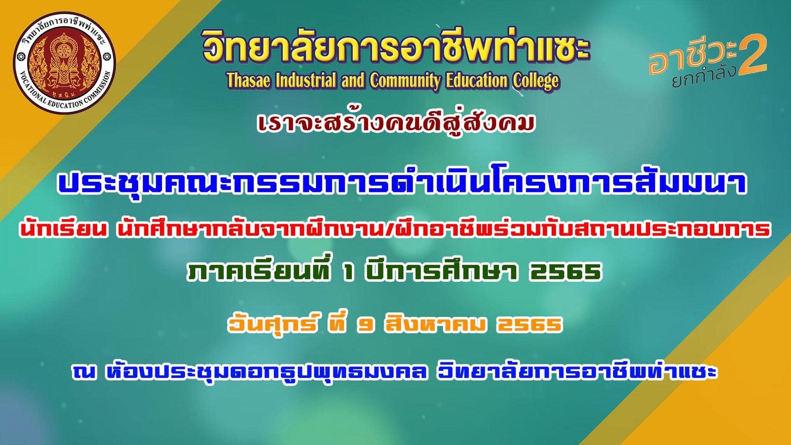วันที่ 9 กันยายน 2565 นายธาริน เหมวิเชียร รองผู้อำนวยการฯ รักษาการในตำแหน่งผู้อำนวยการวิทยาลัยการอาชีพท่าแซะ เป็นประธาน ประชุมคณะกรรมการการดำเนินโครงการสัมมนานักเรียน นักศึกษากลับจากฝึกงาน/ฝึกอาชีพร่วมกับสถานประกอบการ ภาคเรียนที่ 1 ปีการศึกษา 2565 ณ ห้อง :: วิทยาลัยการอาชีพท่าแซะ