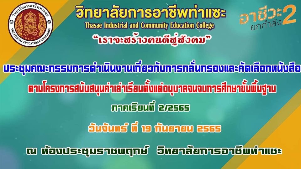 วันที่ 19 กันยายน 2565 นายธาริน เหมวิเชียร รองผู้อำนวยการฝ่ายวิชาการ เป็นประธานประชุมคณะกรรมการการดำเนินการตรวจสอบรายชื่อหนังสือตามแบบเสนอรายการหนังสือเรียนให้มีความเหมาะสมในเรื่องคุณภาพและราคา เพื่อเสนอคณะกรรมการภาคี 4 ฝ่าย ณ ห้องประชุมราชพฤกษ์ ตึกสำน :: วิทยาลัยการอาชีพท่าแซะ